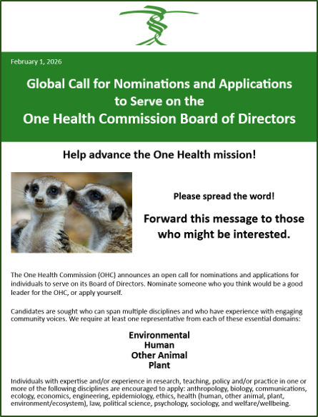 The One Health Commission (OHC) announces an open call for nominations and applications for individuals to serve on its Board of Directors. Nominate someone who you think would be a good leader for the OHC, or apply yourself.