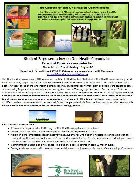 The One Health Commission (OHC) announced on March 30, at the first Students for One Health online meeting, a call for nominations/ applications for six student representatives to serve on its Board of Directors. Two students from each of at least three of the One Health domains (animal, environmental, human, plant or other) were sought to serve, one as voting Representative and one as non-voting Alternate-in-Training representative. Twenty nine highly qualified students from seven countries stepped forward, eager to lead, six from the human domain, nineteen from the animal domain and four working in the environmental/ecology domain. Students selected to serve from August 2015 – August 2016 are...